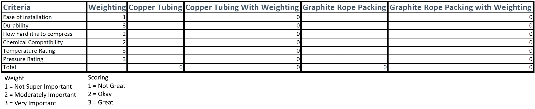 The essential criteria we used to evaluate these seals included: Ease of Installation, Durability, Compressibility, Chemical Compatibility, Temperature Resistance, and Pressure Rating. We've used a weighted decision matrix to ultimately determine which seal is the best. We assigned a weighting to each criteria in accordance with its importance. For simplicity, we chose a scale between 1-3 where 1 is Not super important, 2 = Moderately Important, and 3 = Very Important. We used a similar logic of the scoring as well where 1 = Not Great, 2 = Okay, and 3 = Great.