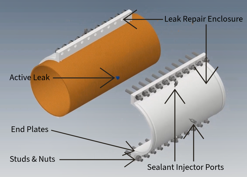 The enclosure is bolted around the compromised pipe section. Sealant is injected into the cavity, filling the space between the enclosure and the pipe, which forms a seal. Think of it as an engineered band-aid over the failed section. This setup acts as a temporary solution, ensuring pressure containment until a permanent repair can be executed during scheduled maintenance.